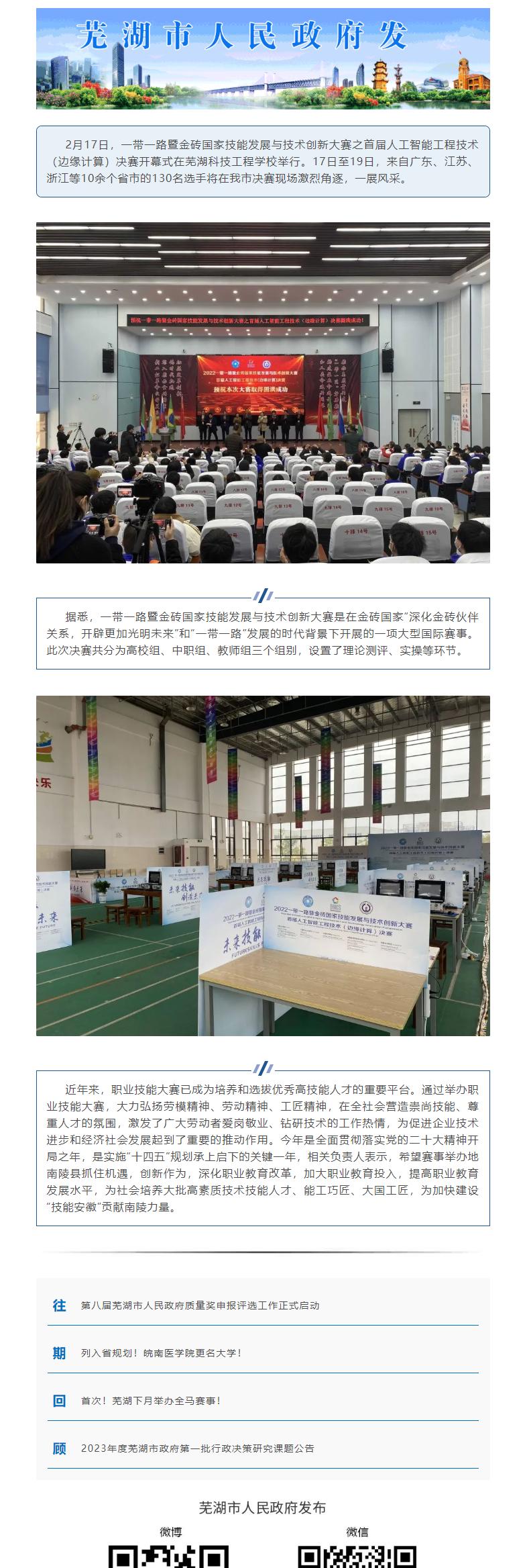 2月17日,一带一路暨金砖国家技能发展与技术创新大赛之首届人工智能工程技术(边缘计算)决赛开幕式在芜湖科技工程学校举行。17日至19日,来自广东、江苏、浙江等10余个省市的130名选手将在我市决赛现场激烈角逐,一展风采。
