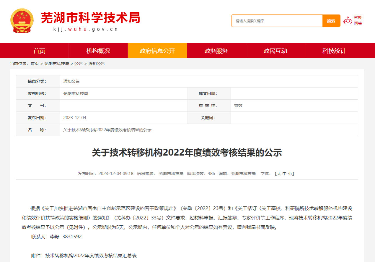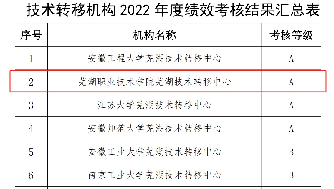 12月4日,芜湖市科学技术局公布了芜湖市技术转移机构2022年度绩效考核评价结果,芜湖职业技术学院芜湖技术转移中心(以下简称“中心”)是此次全市14家技术转移中心考核A级单位之一,也是唯一一家职业院校。