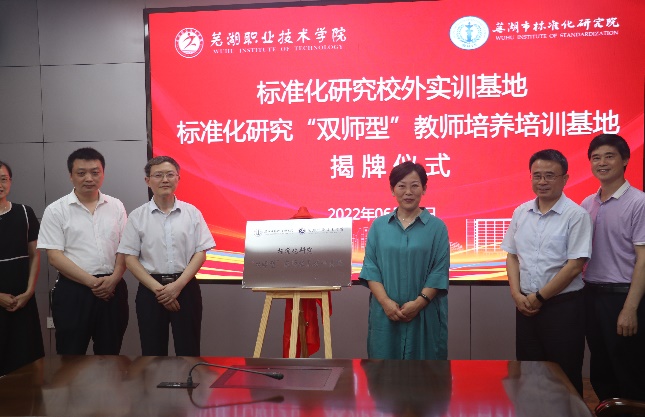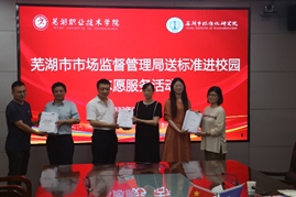 王劲松和刘育红共同为“标准化研究校外实训基地”、“标准化研究‘双师型’教师培养培训基地”揭牌。吴庆国和蒯勇分别代表双方在合作框架协议上签字;随后朱蕾为蒯勇颁发客座教授聘书;最后,市标准化院根据学校专业设置向芜湖职业技术学院赠阅相关技术标准文本近300本,总价值万余元。