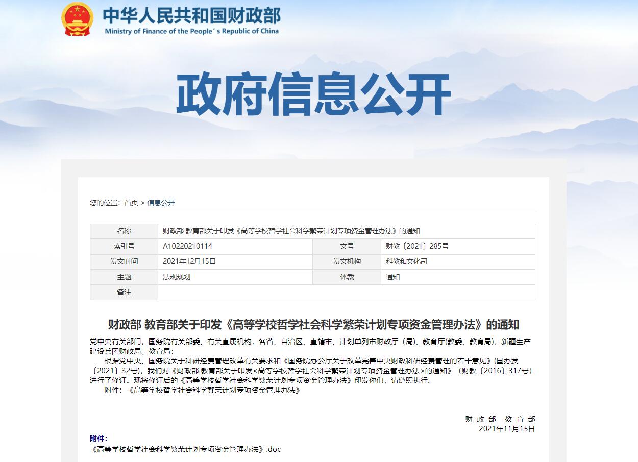 第四十九条 本办法自颁布之日起施行。2016年11月24日财政部、教育部印发的《高等学校哲学社会科学繁荣计划专项资金管理办法》(财教〔2016〕317号)同时废止。