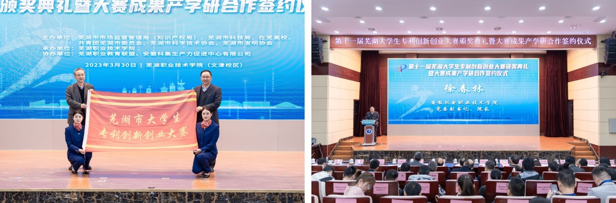 3月30日下午,由芜湖市市场监督管理局(知识产权局)、市科技局、在芜高校、团市委、市科协、市发明协会共同主办,我校承办的第十一届芜湖大学生专利创新创业大赛颁奖典礼暨大赛成果产学研合作签约仪式在文津校区图书馆报告厅成功举行。安徽省市场监督管理局党组成员、副局长,省知识产权局局长程胤,安徽省市场监督管理局知识产权运用促进处一级调研员虞东海,芜湖市市场监督管理局(知识产权局)党委书记、局长唐诚,副局长朱寿发,市发明协会、市科技局、市科协、团市委等相关部门领导、各参赛高校主要负责人、获奖选手和指导教师代表,以及企业代表共计130余人参加了本次颁奖典礼。校党委副书记、院长高武,副院长刘育红出席本次颁奖典礼,典礼由经济管理学院教师阮妙茹主持。