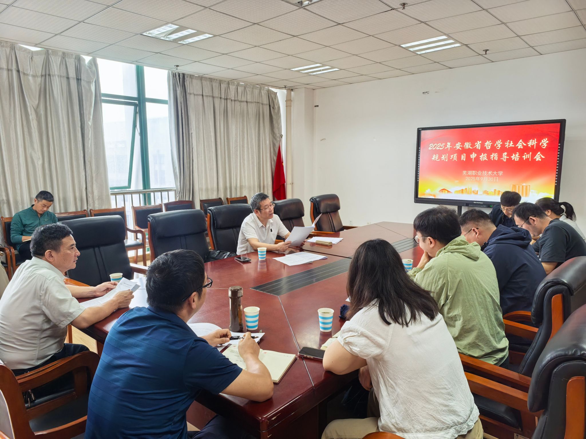 为做好2025年安徽省哲学社会科学规划项目的申报指导工作,助力申报教师精准发力,进一步提升我校项目申报质量,9月30日校科研处组织开展了2025年安徽省哲学社会科学规划项目申报指导培训会,特邀安徽师范大学徐彬教授、王静教授等两名专家作专题指导。会议由校科研处处长吴庆国主持,省哲学社会科学规划项目申报人、学校引进青年博士等三十余人参会。